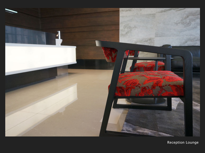 訪客在接待休息區聚集討論時,將感受到舒適的體驗。這一設計靈感來自於古老的中國迎賓精神,猶如圍繞篝火進行對話。天花板、咖啡桌和地毯上的交叉條紋圖案是火柴的抽象圖像。那對紅色椅子反映了火的溫暖,以及主人對訪客的熱情,而吧台區的LED燈架提供了一個輕鬆的背景。